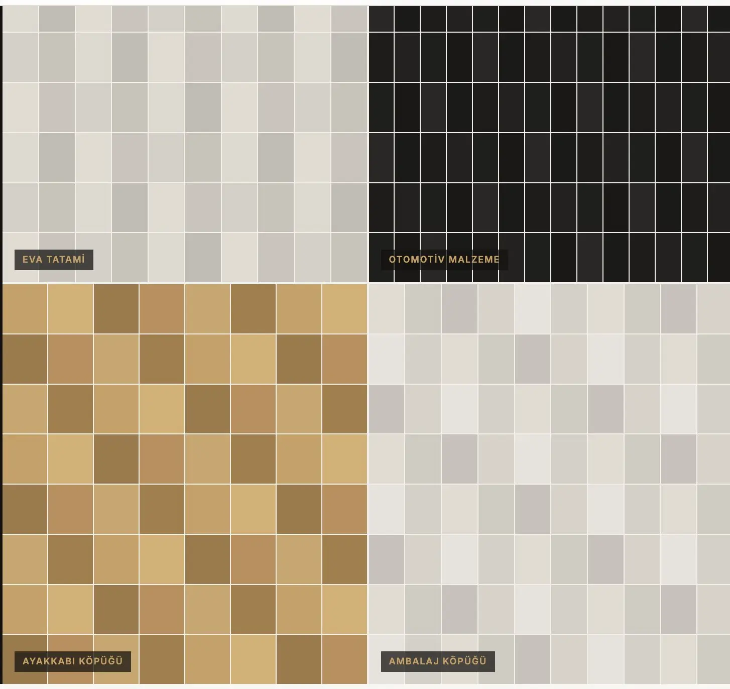 Kapalı hücreli yapısıyla su geçirmeyen, antibakteriyel, hafif ve dayanıklı EVA köpük; farklı yoğunluk, kalınlık ve renk kombinasyonlarında üretilebilmekte, her sektörün özel ihtiyacına göre şekillendirilebilmektedir.